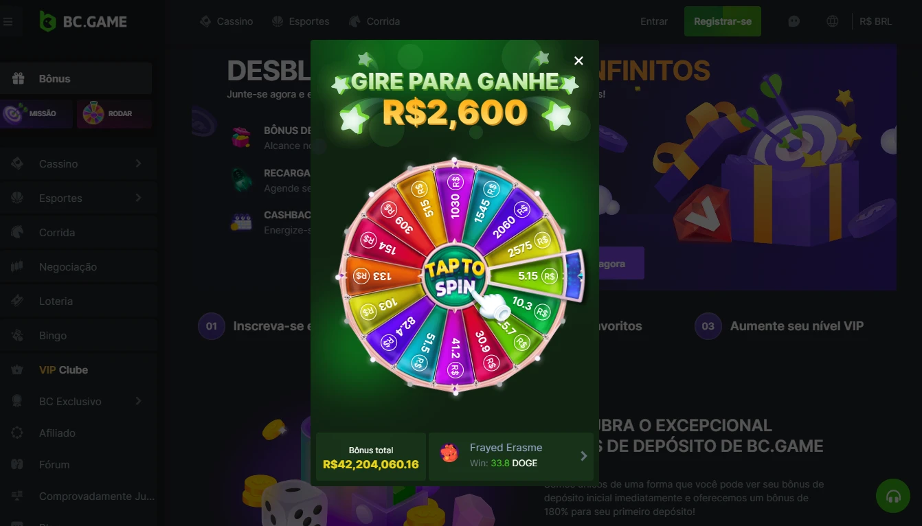 O primeiro passo para usar o BC.Game apostas é ter um registro. Depois disso, você fica elegível para receber até 360% de bônus nos 4 primeiros depósitos.