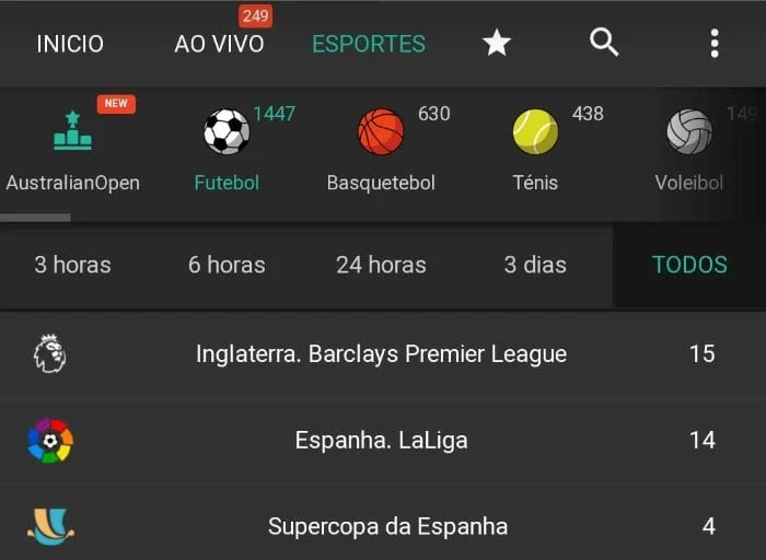 Não tive dificuldade em encontrar esportes e ligas, achei bem criativa a disposição das modalidades em um menu deslizante.