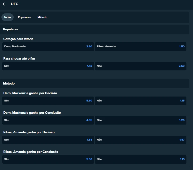 Além do mercado resultado final, plataformas como Bet365, Stake e Betfair oferecem variedade de opções para palpites na luta Mackenzie Dern x Amanda Ribas: